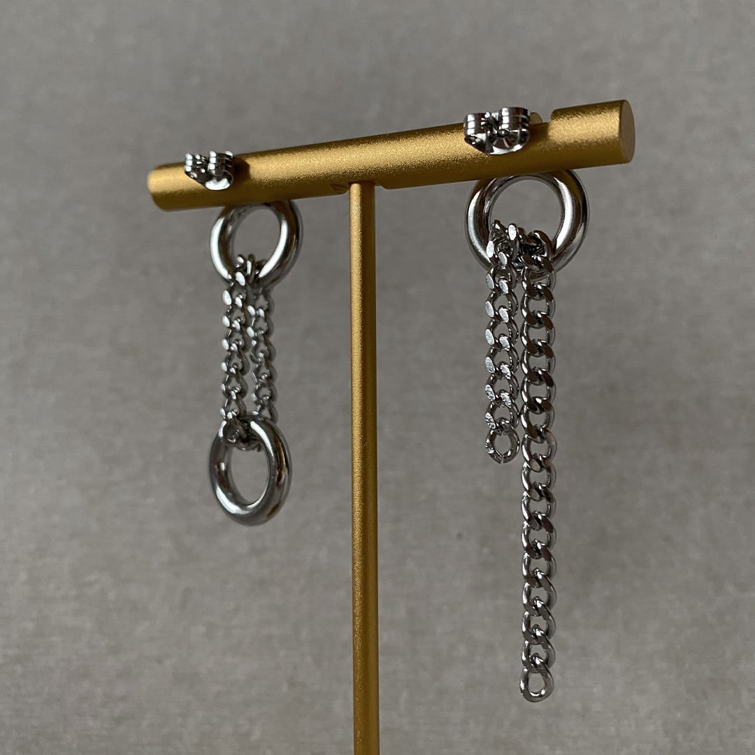 アシンメトリーなデザインが際立つスタイリッシュなピアスです。リングとチェーンの組み合わせが、洗練された印象を与え、どんなコーディネートにも華やかさをプラスします。